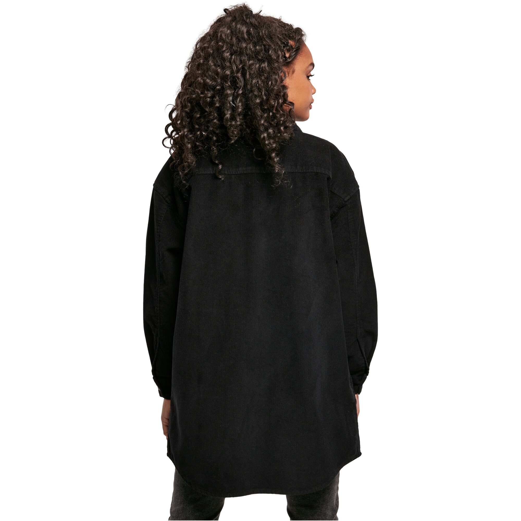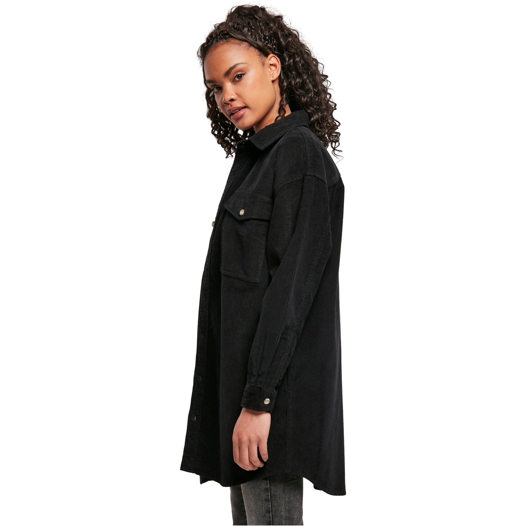Das Hemd fällt bis über den Po, wobei das Rückenteil etwas länger geschnitten ist. Der Saum vorne und hinten ist rund. Das Frauen Shirt besteht aus robustem Baumwoll-Kord und fällt oversize aus.